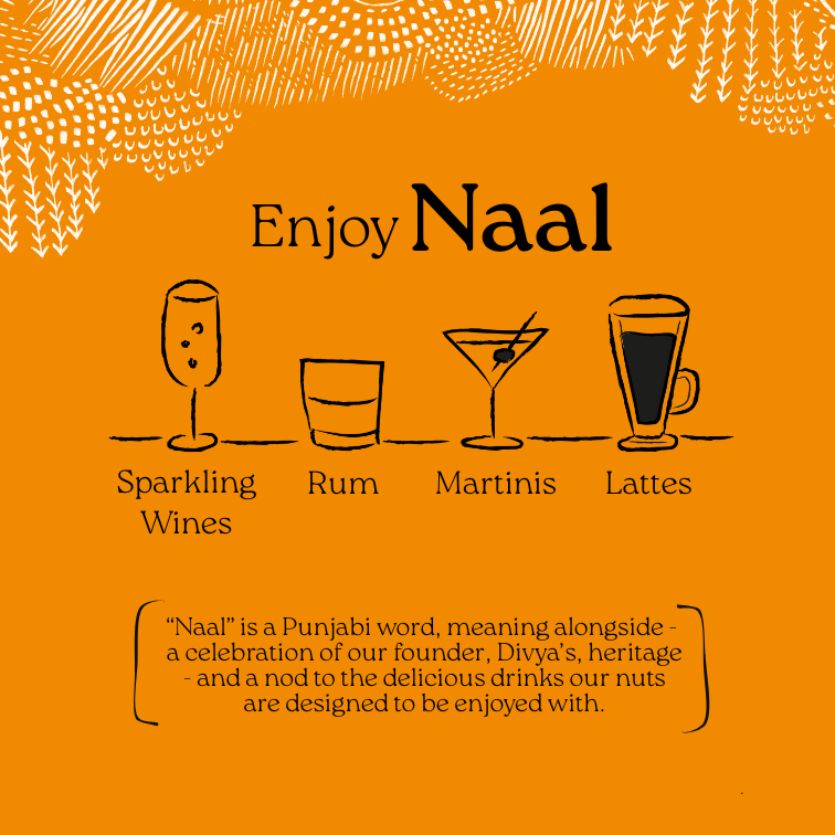 Nalo is inspired by the Punjabi word NAAL, meaning alongside - a celebration of our founder Divya’s heritage - and a nod to the delicious drinks our nuts are designed to be enjoyed with.