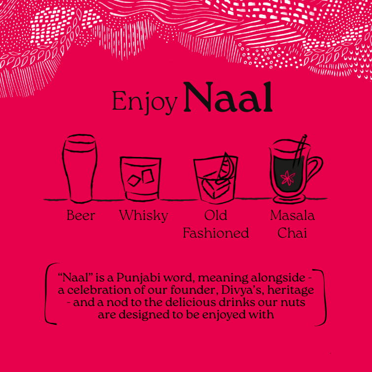 Nalo is inspired by the Punjabi word NAAL, meaning alongside - a celebration of our founder Divya’s heritage - and a nod to the delicious drinks our nuts are designed to be enjoyed with.
