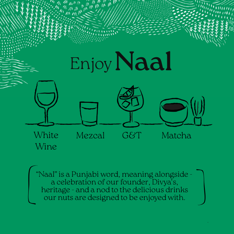 Nalo is inspired by the Punjabi word NAAL, meaning alongside - a celebration of our founder Divya’s heritage - and a nod to the delicious drinks our nuts are designed to be enjoyed with.